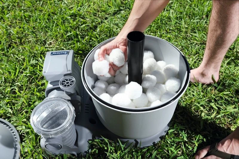 Let op: wanneer je gebruik maakt van de Bestway Flowclear Polysphere bollen kun je geen gebruik maken van de backwash functie van de zandfilter. Je reinigt de filterbollen met de hand.